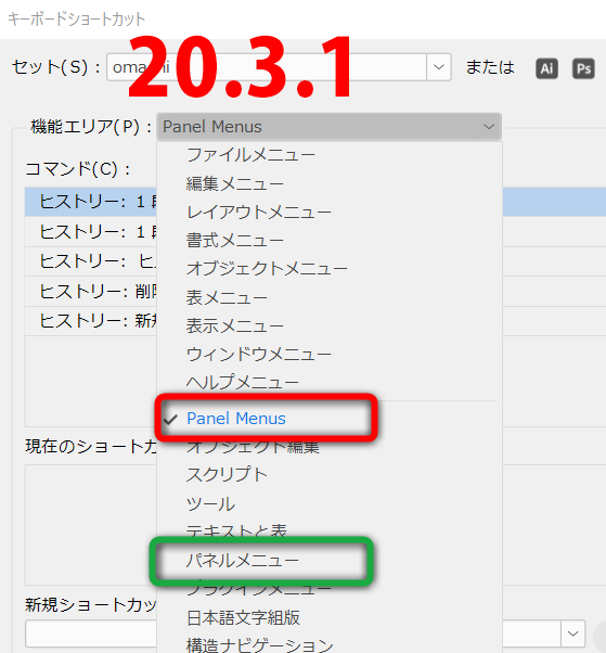 キーボードショートカット編集ダイアログ内のパネルメニューの項目に変更があります。実はこれ、2024(19.0.0)からおかしかったんですが、少し直っています。