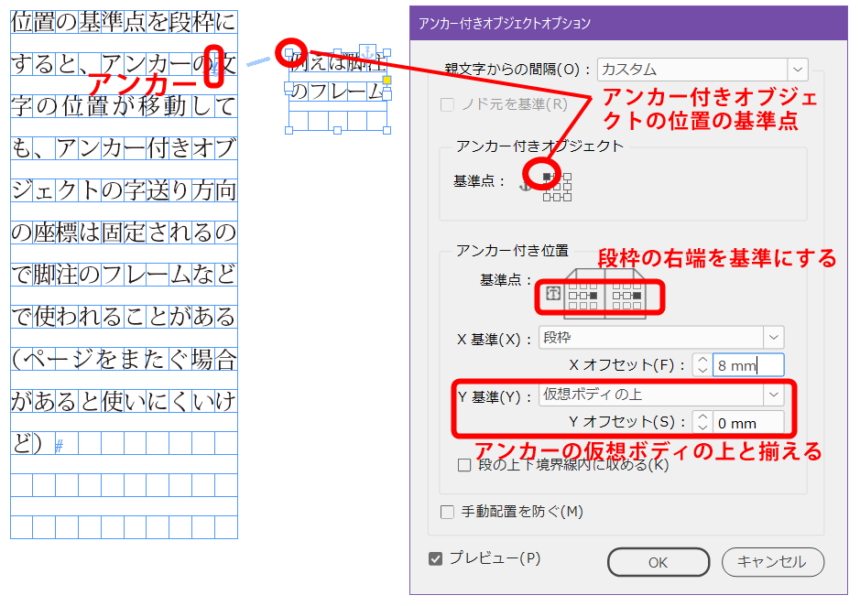 アンカー付きオブジェクトは、この段枠を基準にすることができます。一般的な使い方はオブジェクトを文字送り方向に固定するものです。横組ですとX座標が常に固定となります。次の図のようにX座標を固定してY座標はアンカーとともに移動するといった使い方になります。