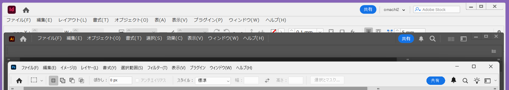 ちょっとわかりにくいですが、Windows 11ではウィンドウの角に丸みがあるんですよね。PhotoshopはWindows 11のAPIに従っているので、ほかのWindowsアプリケーションと同様の丸みがあります。これに対して、InDesignとIllustratorはそれぞれ独自の実装をしています。