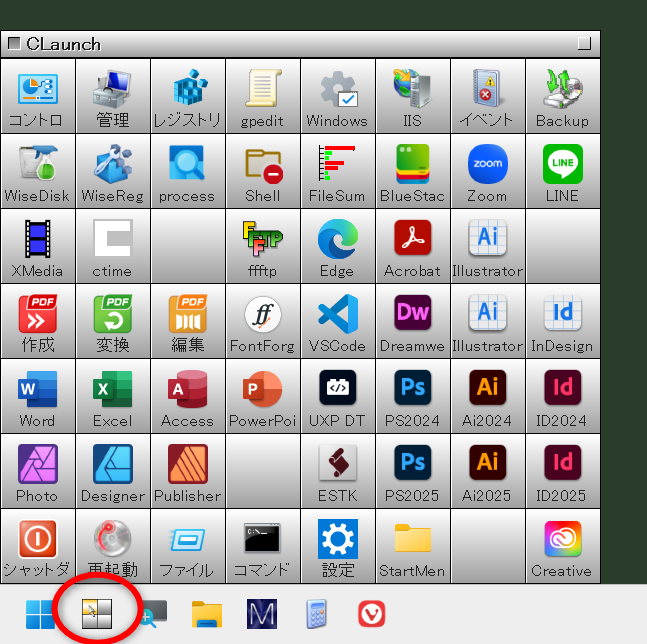 そのため、CLaunchを使用することにしました。これはWindows XP時代に使用していて、Windows 7になってから使用をやめたものです。Windows 10のタイルメニューは使いやすかったんですが。それで今回復活しました。スタートメニューの隣に置いています。Windowsメニューを消せれば完璧なんですが、さすがにそれは無理でした。