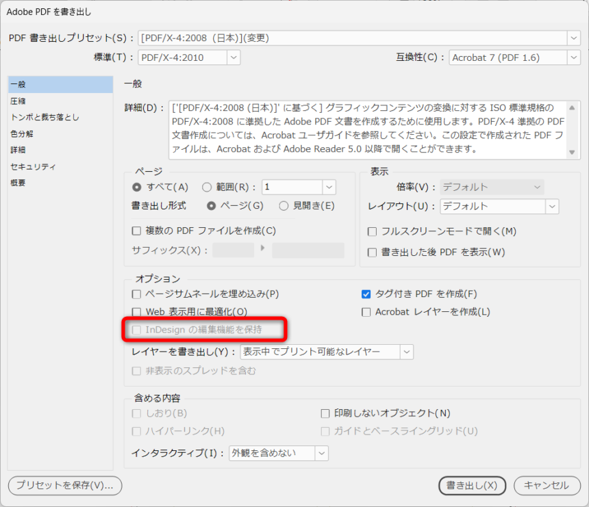 これは「PDF書き出し」「インタラクティブPDF書き出し」ダイアログに「InDesign編集機能を保持」をつけたよと言っています。下図のように、確かに項目はあるのですが、日本語版ではどうやってもここがグレーアウトのままで有効にできないようです。先にインターフェイスだけ実装しているみたいですね。