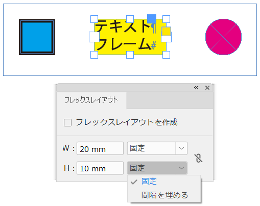 フレックスアイテムの設定箇所は4か所です。まずWとH、つまりフレックスアイテムの大きさです。これはコントロールパネルや変形パネルで表示されるものと同じです。(ですからなくてもいいんですが、あった方が便利です。)ここに数値を入力すると、右のプルダウンは「固定」に変更されます(数値を指定しているので当然の挙動ですね)。