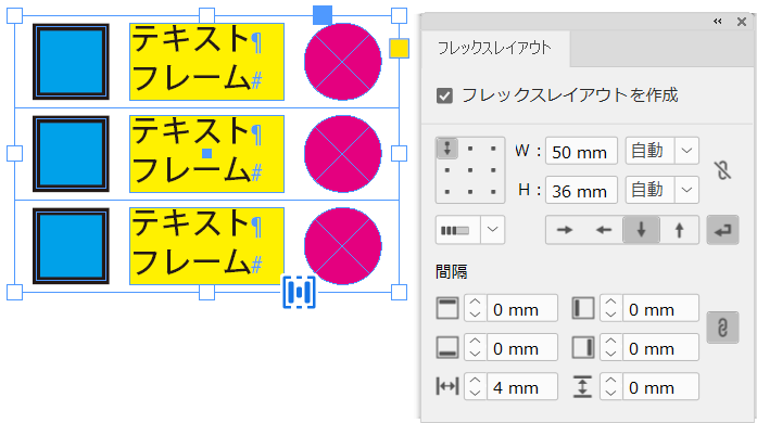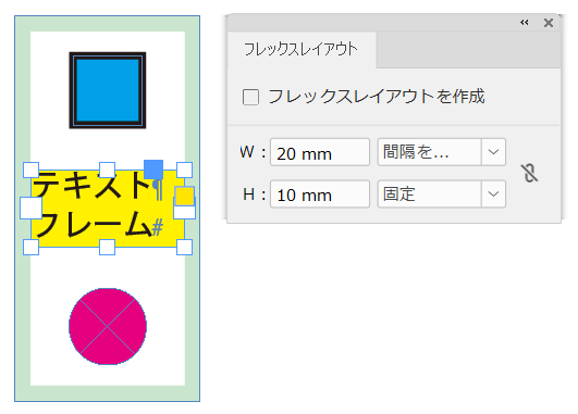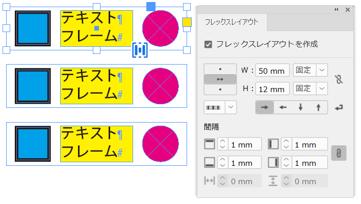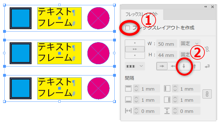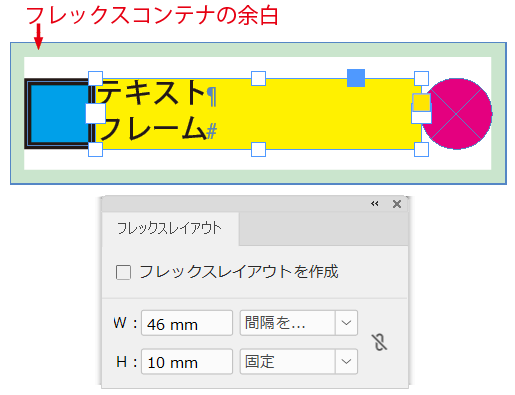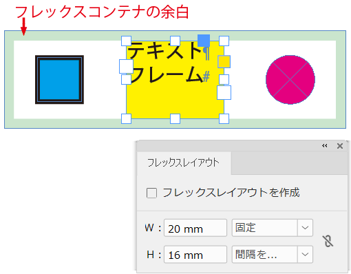 そして、中に入ったフレックスコンテナの高さを「間隔を埋める」に変更します(3つとも)。フレックスコンテナの余白が0の場合は非常に選択しにくいので、レイヤーパネルから選択するか、中のフレックスアイテム(この例では長方形とテキストフレームと円形の画像フレーム)のどれかを選択してESCキーを押してください。