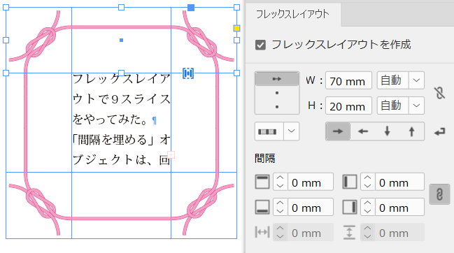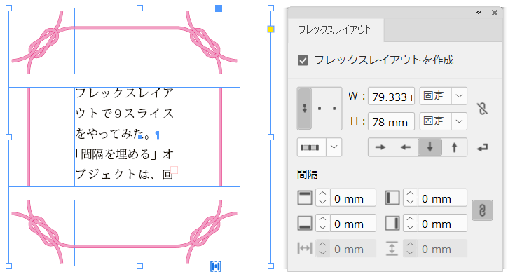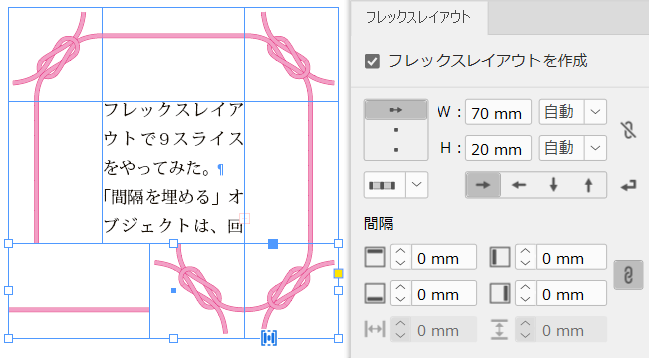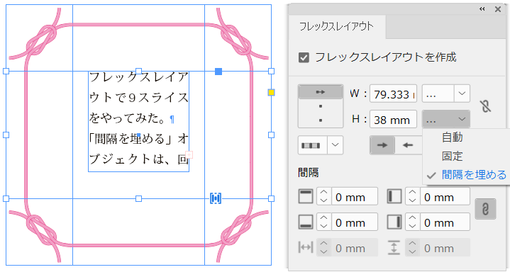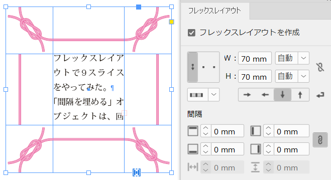 中央のテキストフレームは縦横ともに「間隔を埋める」ですね。